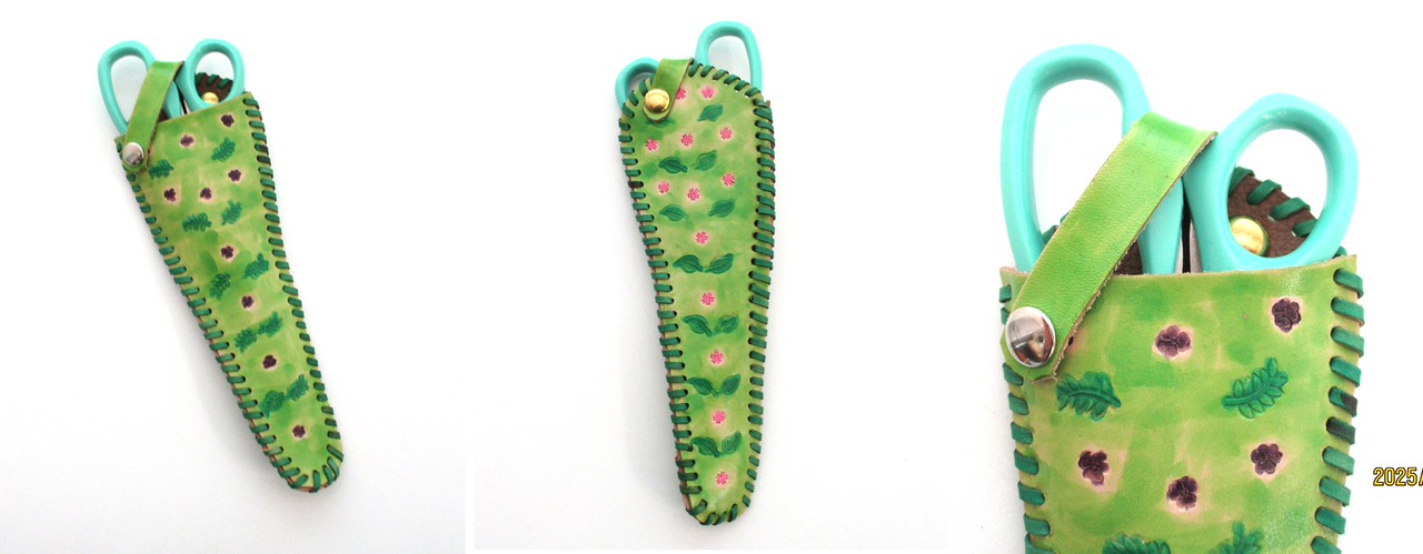 こちらは、集団プログラム「革細工」で作成された「はさみ入れ」。 表に”すみれ”、裏に”桜”をあしらった素敵なデザインです♪