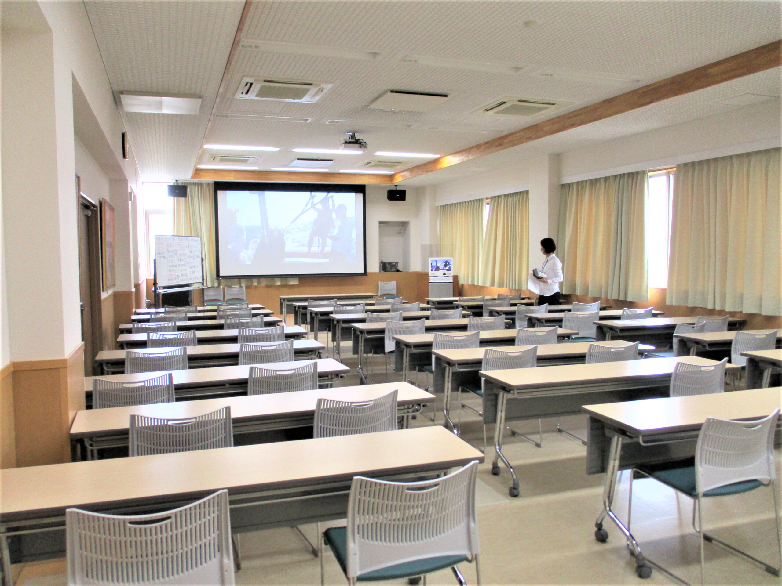 「とも」の人気プログラムのひとつ「楽しい♪合唱&カラオケ」。毎週(水)の午前中にやっています。ときどき「この時期にどうやって?」とご質問をいただきます。実は2階にある「とも」の真上、3階に「コミュニティルーム」というお部屋があり、学校形式なら50人以上が座れる広さがあります。ここなら、15人前後までなら2m以上離れて着席できるので、「全員鼻をおおってマスク着用」「対角線で窓を開けて換気」しながら歌うことができます。マスクをしながらなので、もどかしさはありますが、コロナ禍ではなかなかできない、楽しく歌う機会になっています。