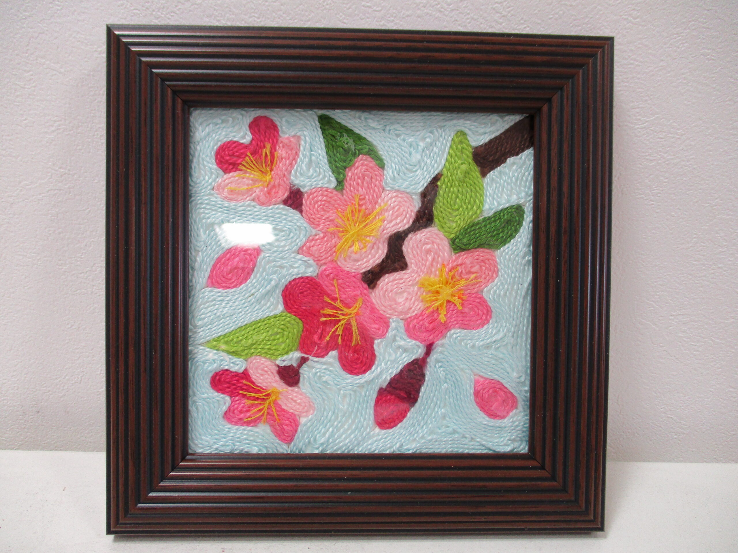 「デイケアとも」では、プログラムや個人活動で、色々な「ものづくり」ができます。今回は個人活動で取り組まれた「刺繍糸の絵」をご紹介します。粘着ボードに刺繍糸を貼っていく「糸の詩」というシリーズの手芸キットなのですが、細かいところも1本1本丁寧に貼り付けてくださっています。桜の花びらの濃淡がきれいに出ていますね♪