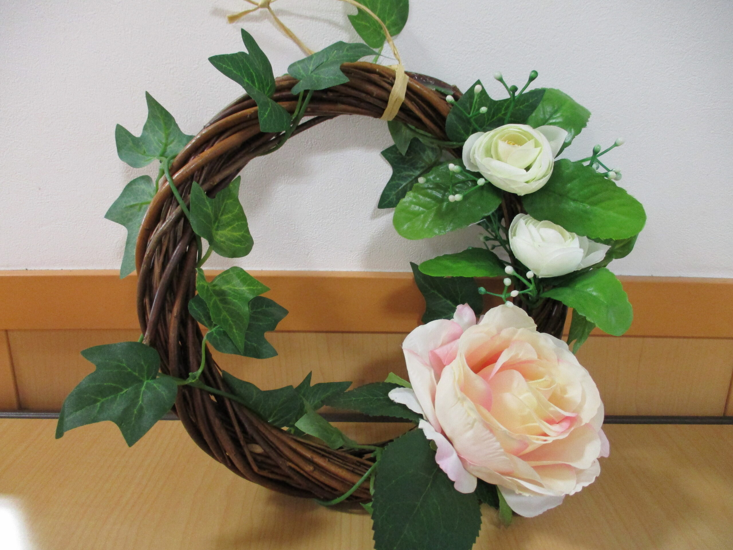 5月22日(土)に行った単発プログラム「オリジナルのサマーリースを作ろう!」。11名のご参加で大盛況でした。「グルーガン」という樹脂を固める道具で造花を接着し、自分の好きなデザインにリースを飾り付けていきます。材料は100均で手に入るものばかり。「グルーガン」での作品作りは初めての方も多かったのですが、続々と見栄えの良い作品ができ上がりました♪きっと夏らしく皆さんのお部屋を飾ってくれることでしょう。