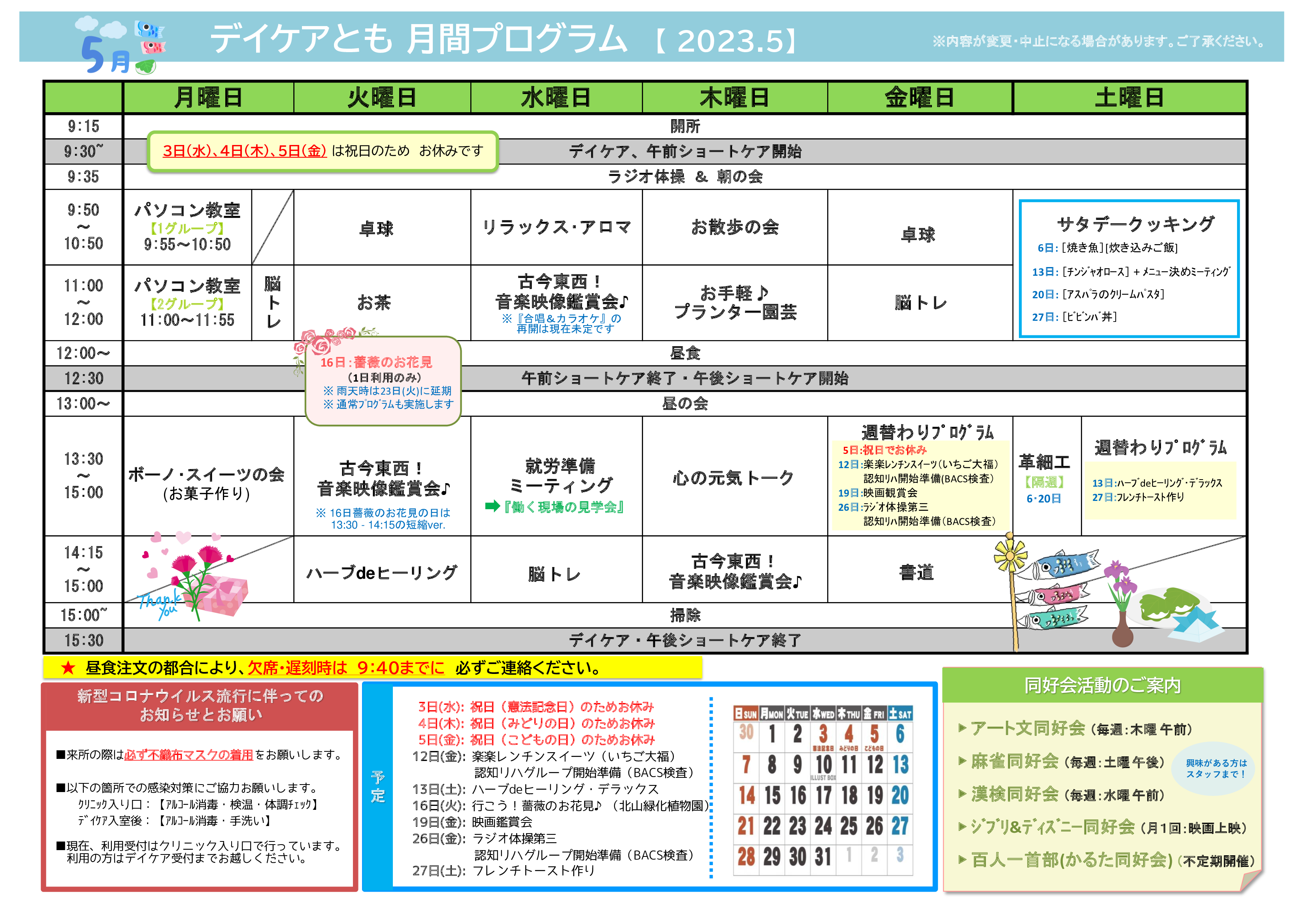5月の月間プログラム表ができました! 5月もいろいろやります♪ お楽しみに~