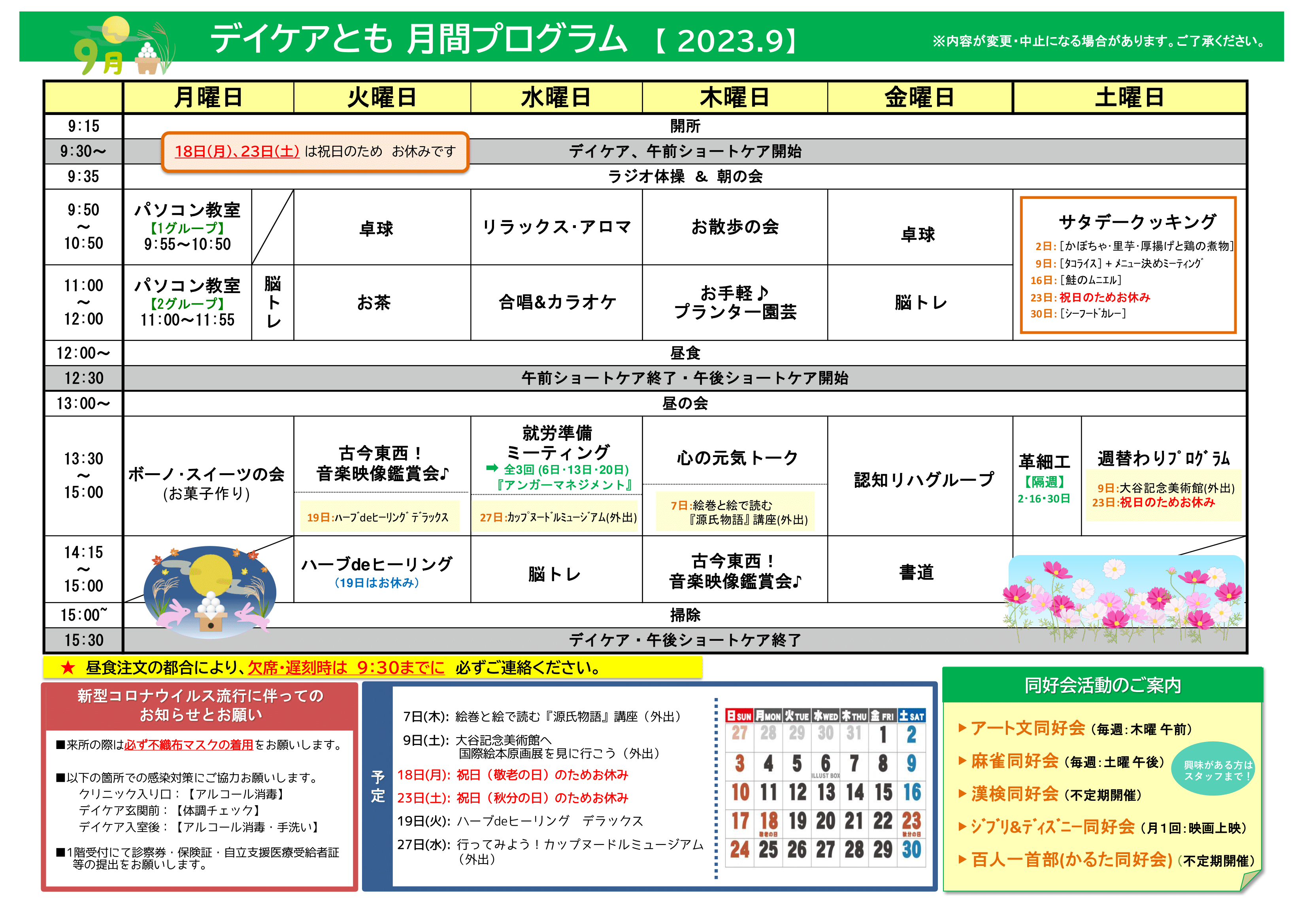 9月の月間プログラム表ができました! 来月もいろいろやります♪ お楽しみに~