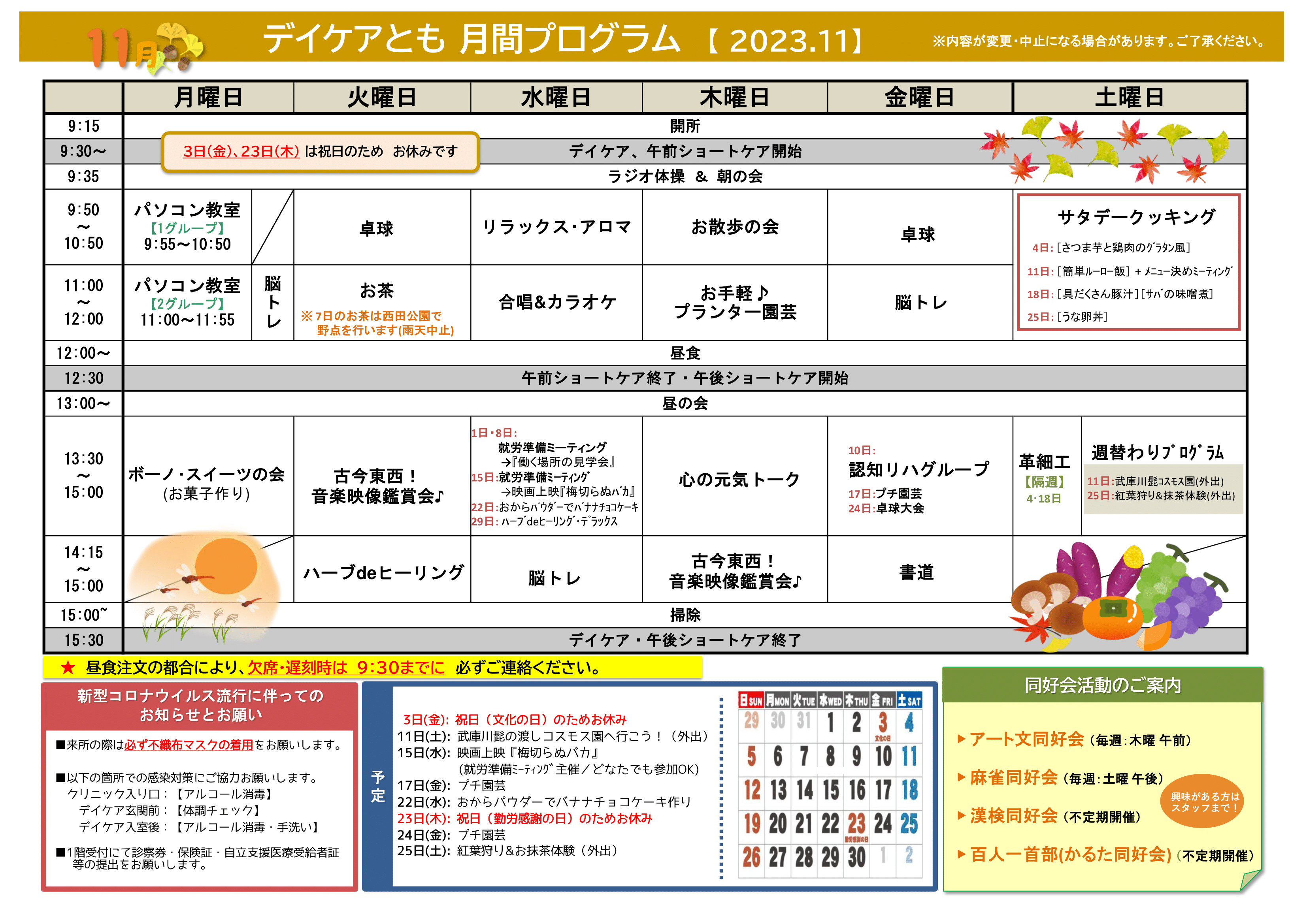 11月の月間プログラム表ができました! 来月もいろいろやります♪ お楽しみに~