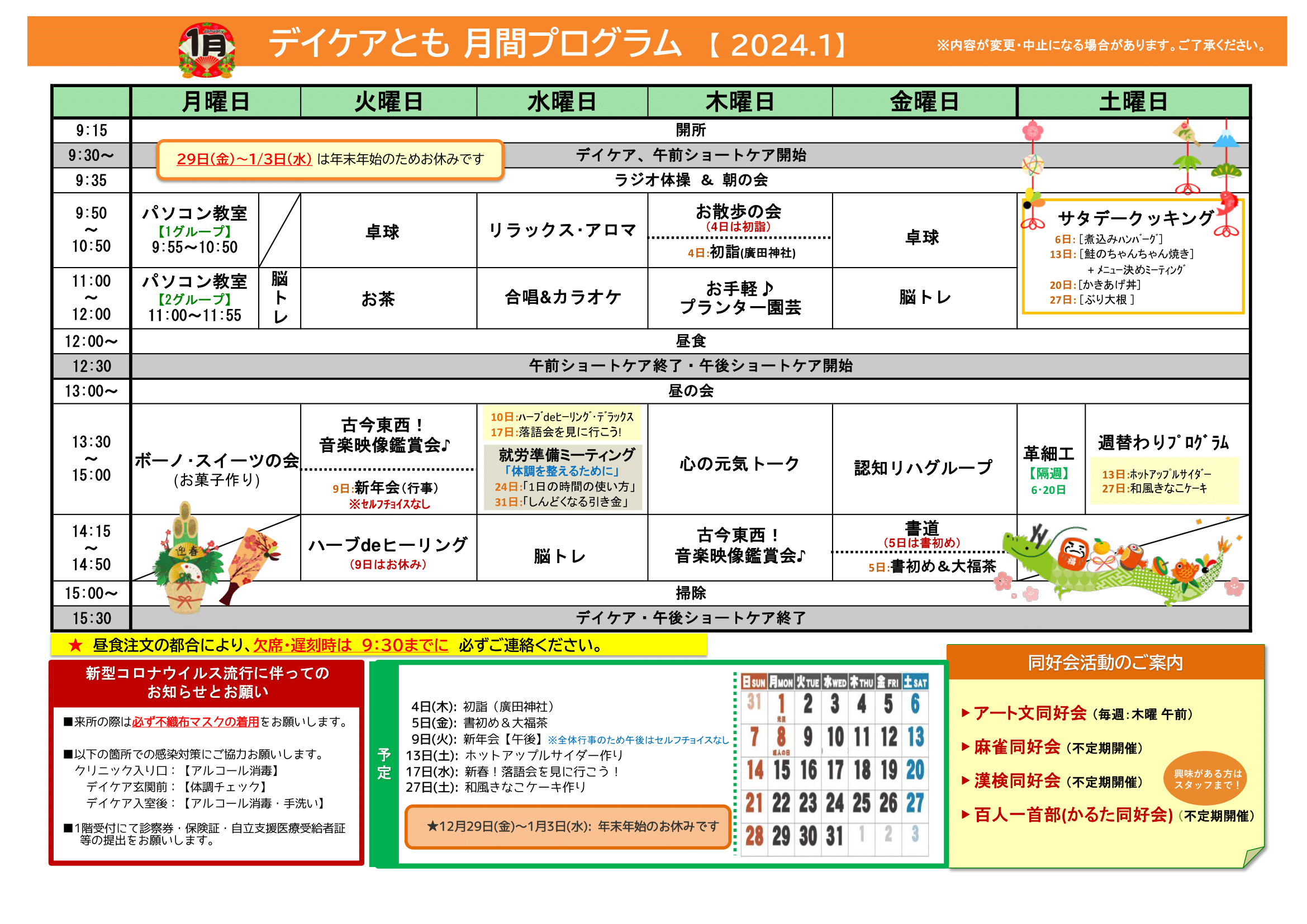 1月の月間プログラム表ができました! 来月もいろいろやります♪ お楽しみに~