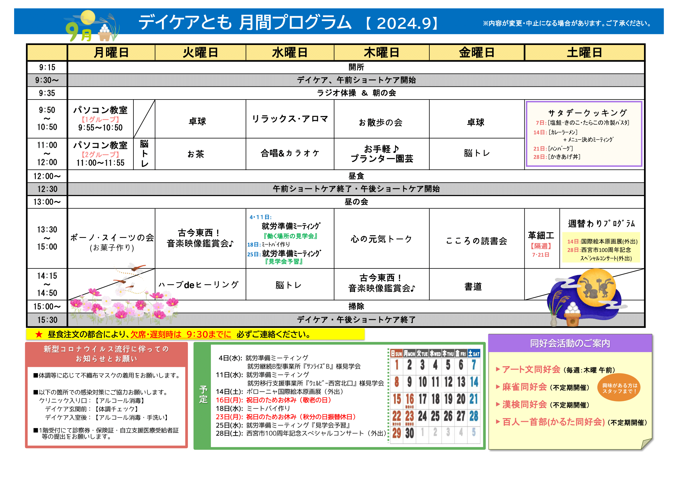 9月の月間プログラム表ができました! 来月もいろいろやります♪ お楽しみに~