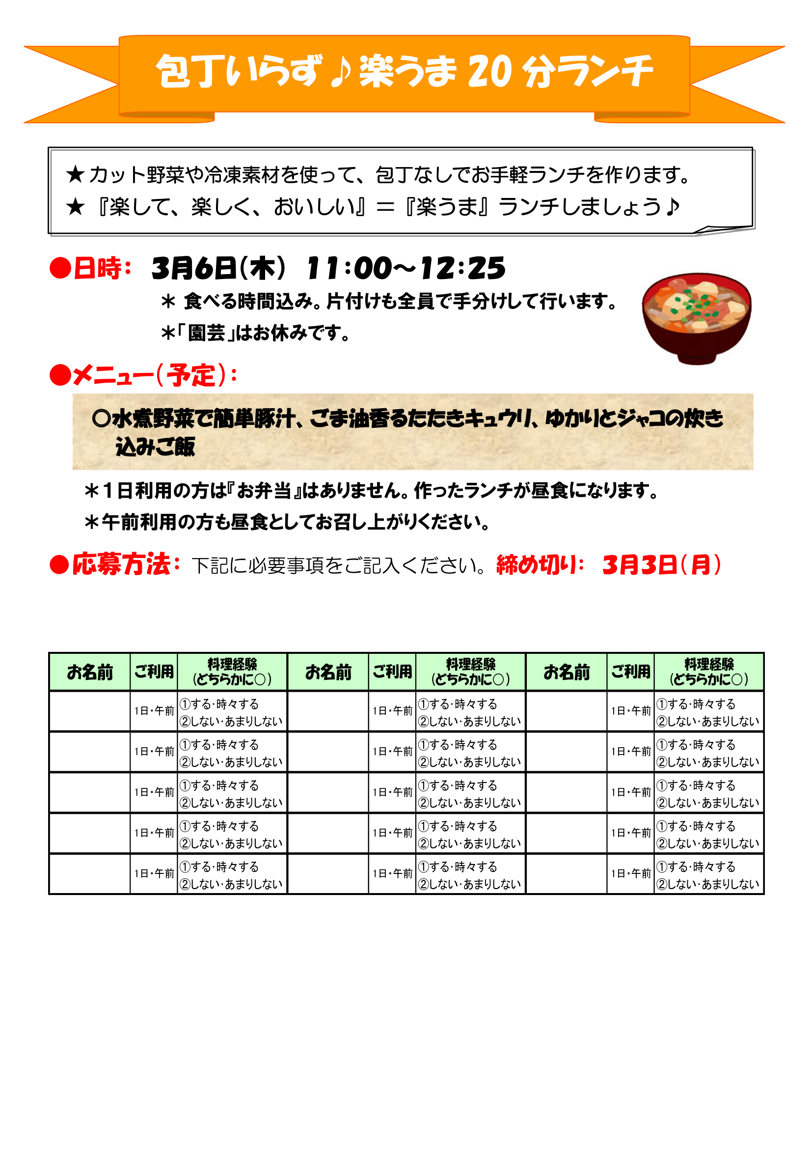 3月6日(木)「包丁いらず♪楽うま20分ランチ」