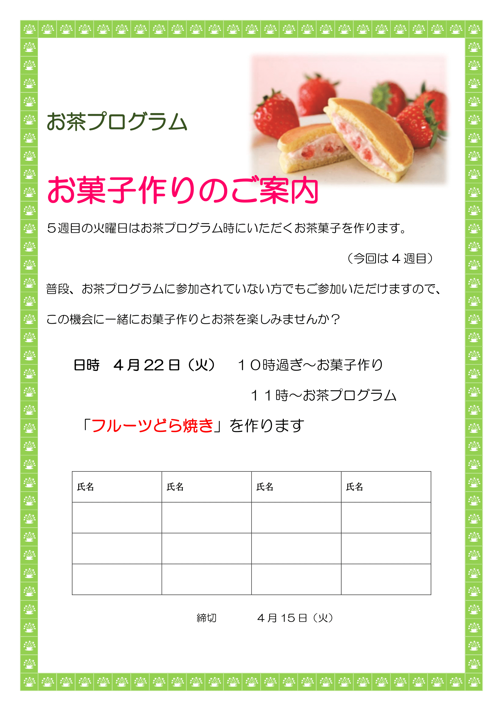 4月22日(火)「お茶プログラム:フルーツどら焼き」