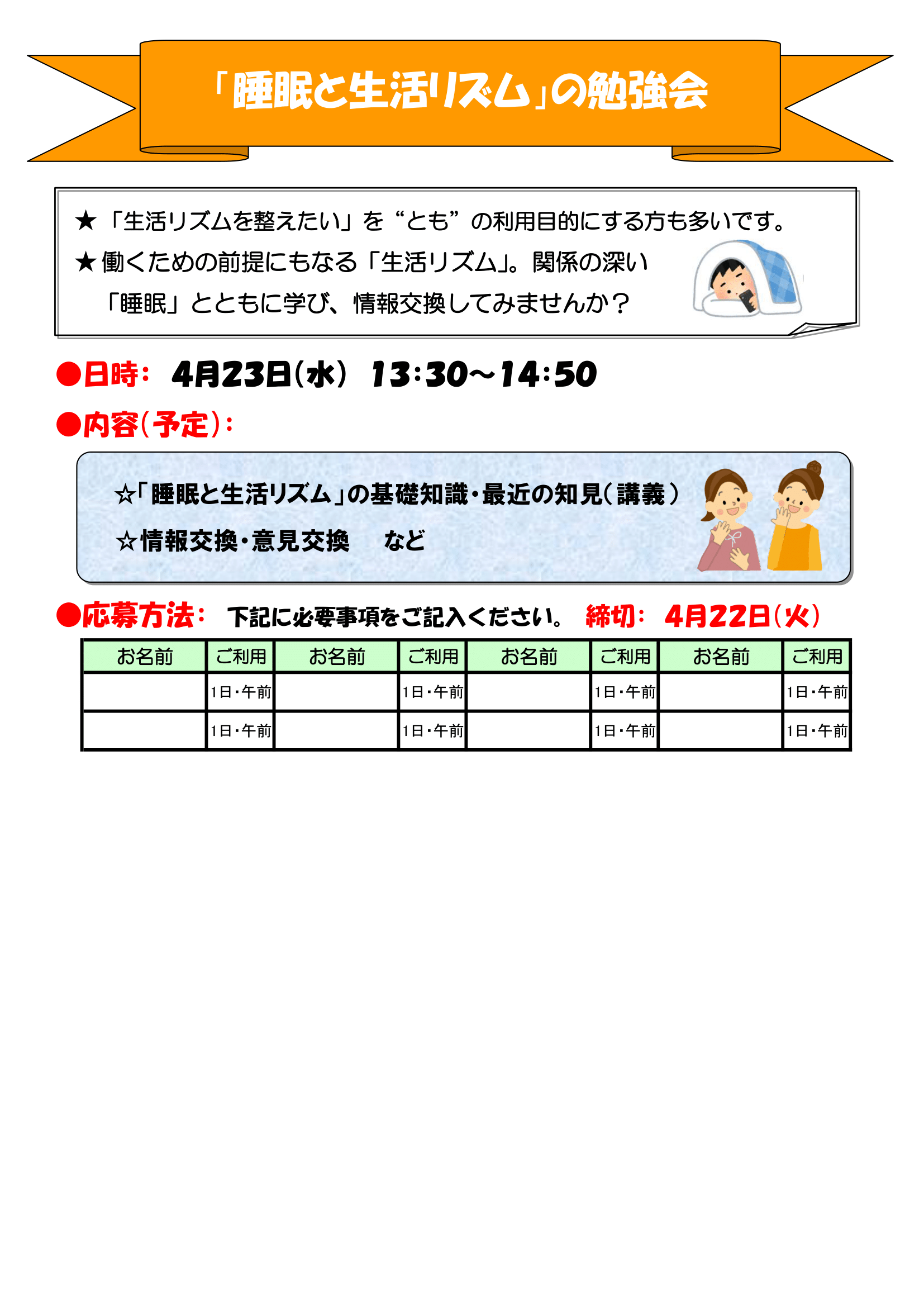 4月23日(水)「睡眠と生活リズムの勉強会」
