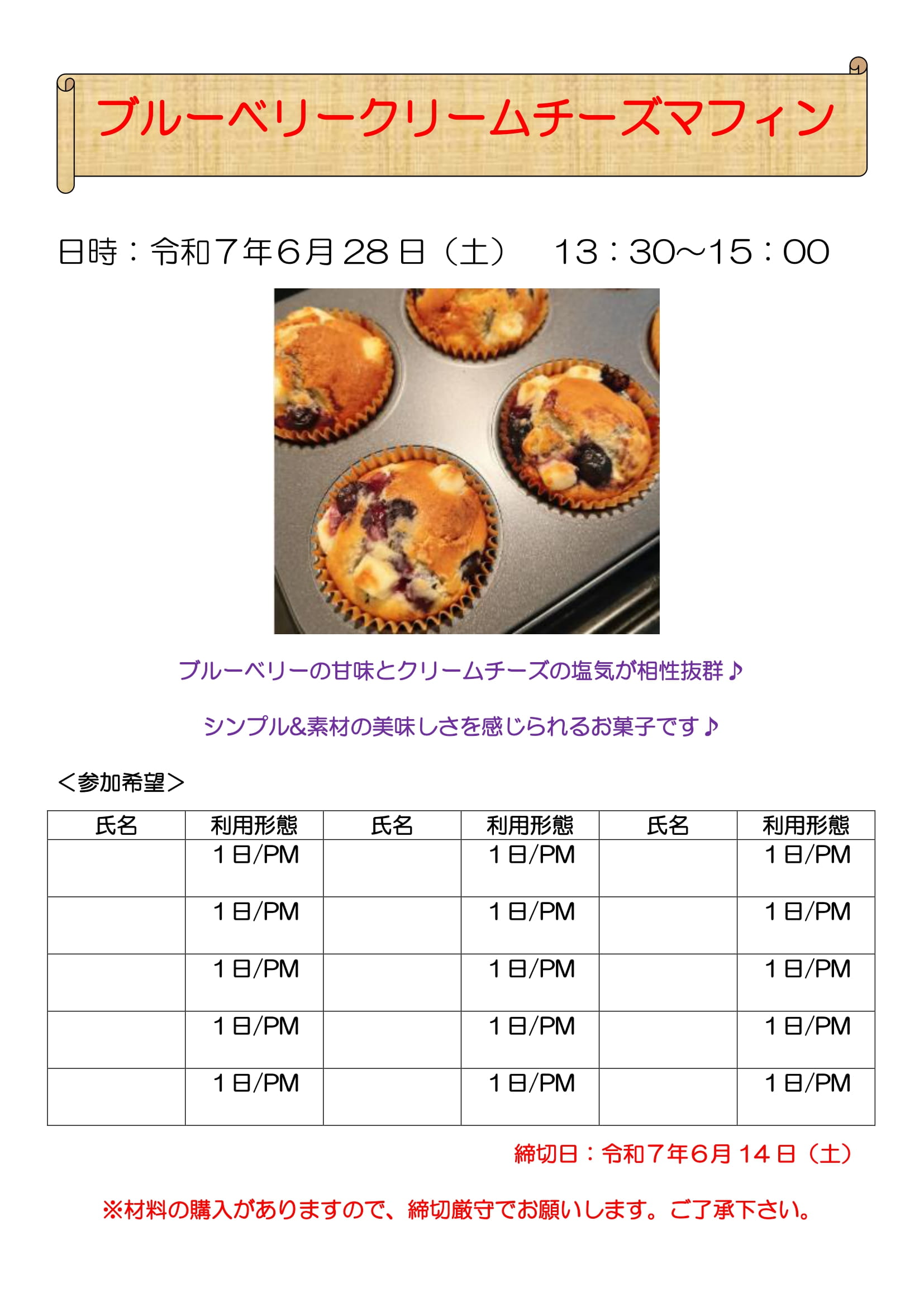 - 6月28日(土)「ブルーベリークリームチーズマフィン作り」