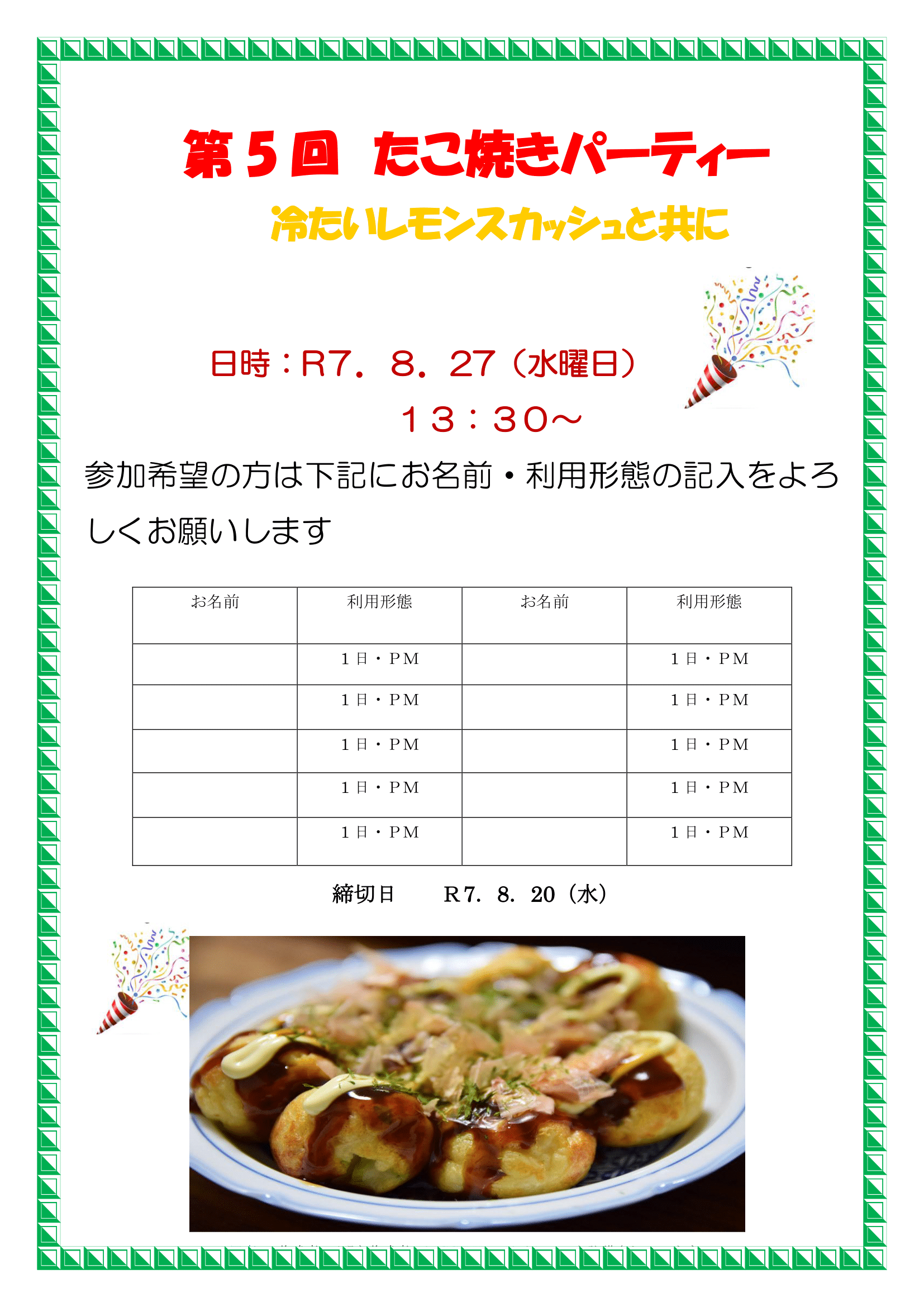 - 8月27日(水)「たこ焼きパーティー&レモンスカッシュ」