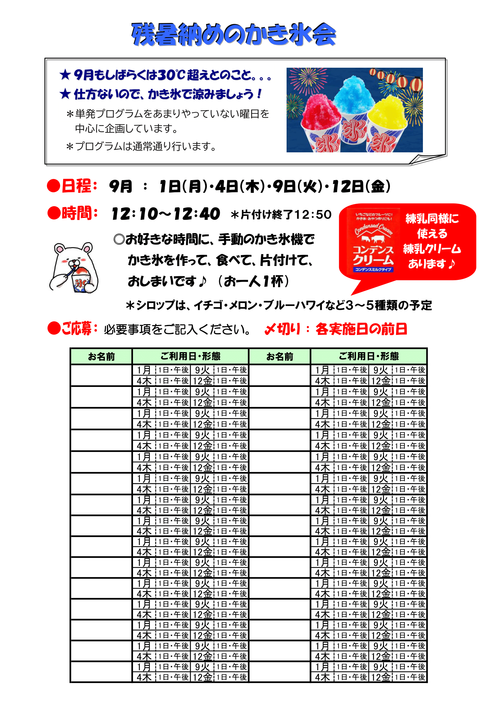 - 9/1・4・9・12『残暑納めのかき氷会』