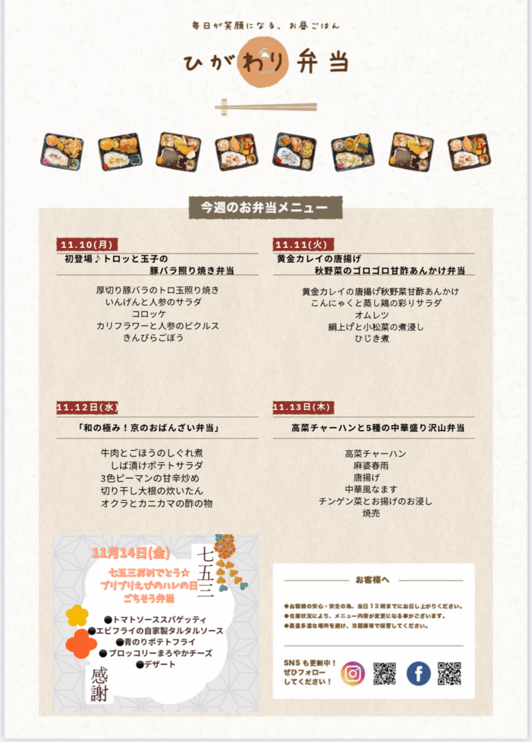 デイケアともでは、(月)~(金)の昼食として、就労継続支援B型事業所「西宮ひがわり弁当」様のお弁当をご提供しています(1日利用の方は無料です)。半日利用の方も実費(650円)で注文できます。来週もとても美味しそうなメニューばかりですね~😊😊😊 お楽しみに!