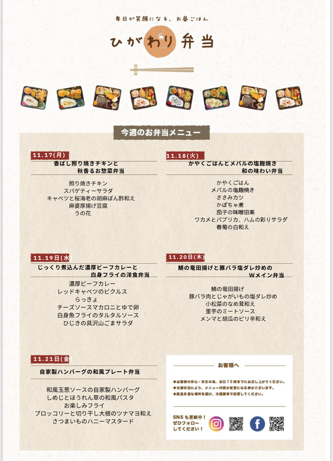 デイケアともでは、(月)~(金)の昼食として、就労継続支援B型事業所「西宮ひがわり弁当」様のお弁当をご提供しています(1日利用の方は無料です)。半日利用の方も実費(650円)で注文できます。来週もとても美味しそうなメニューばかりですね~😊😊😊 お楽しみに!