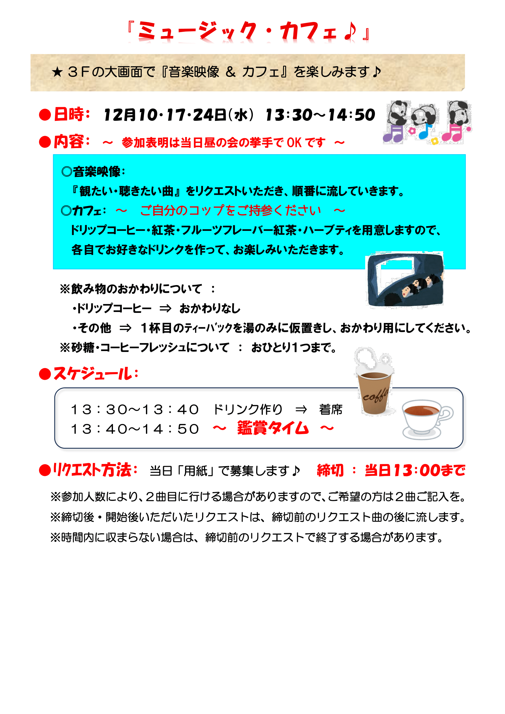 - 12/10・17・24(水)「ミュージック・カフェ」