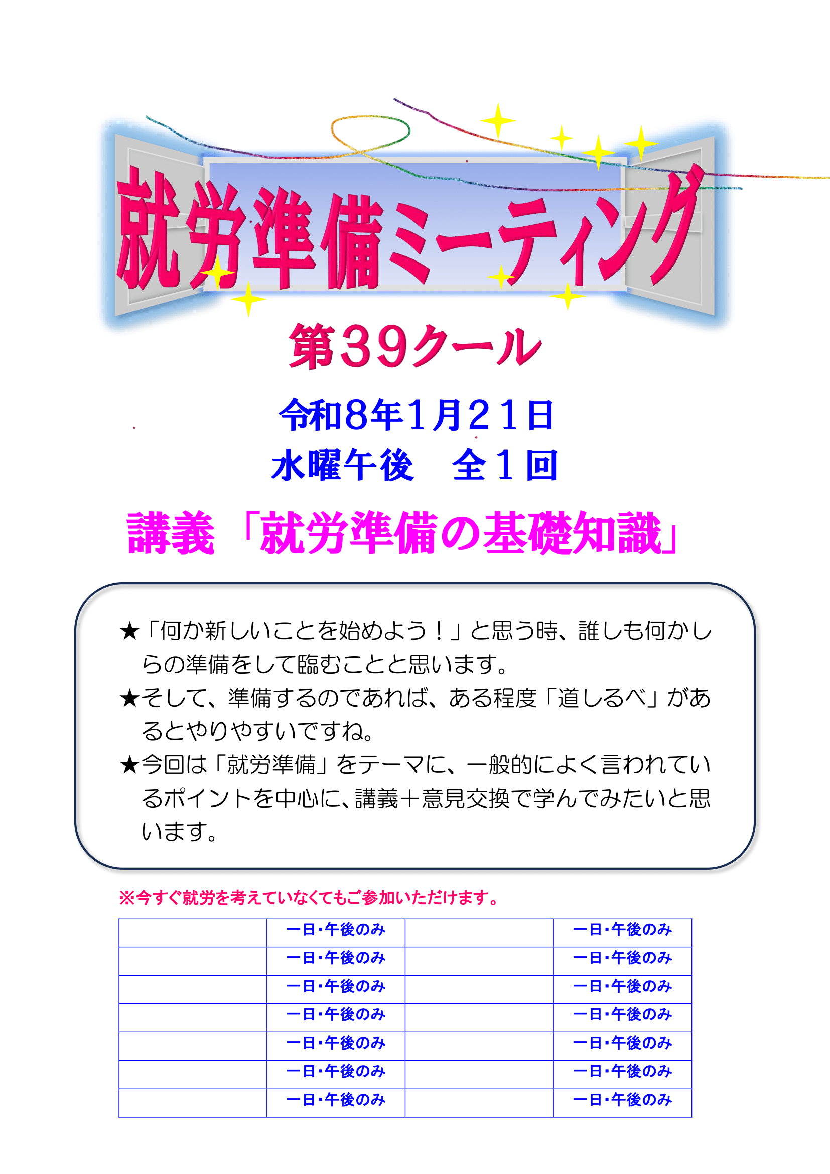 - 1月21日(水) 就労準備ミーティング『講義:就労準備の基礎知識』