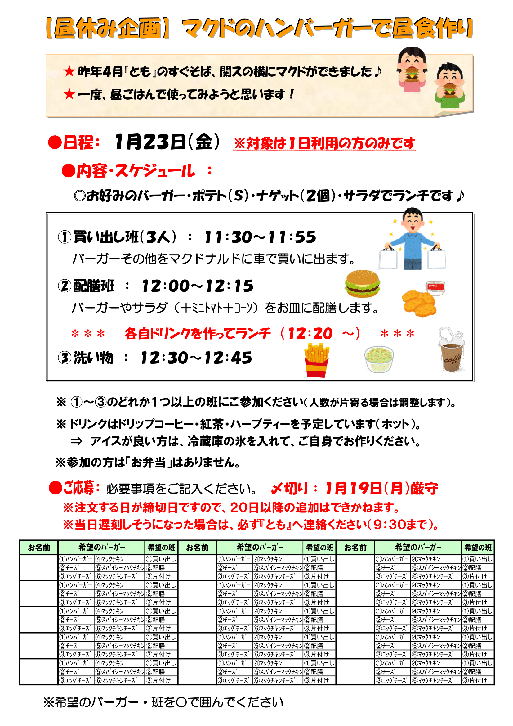 - 1月23日(金)「マクドのハンバーガーで昼食作り」