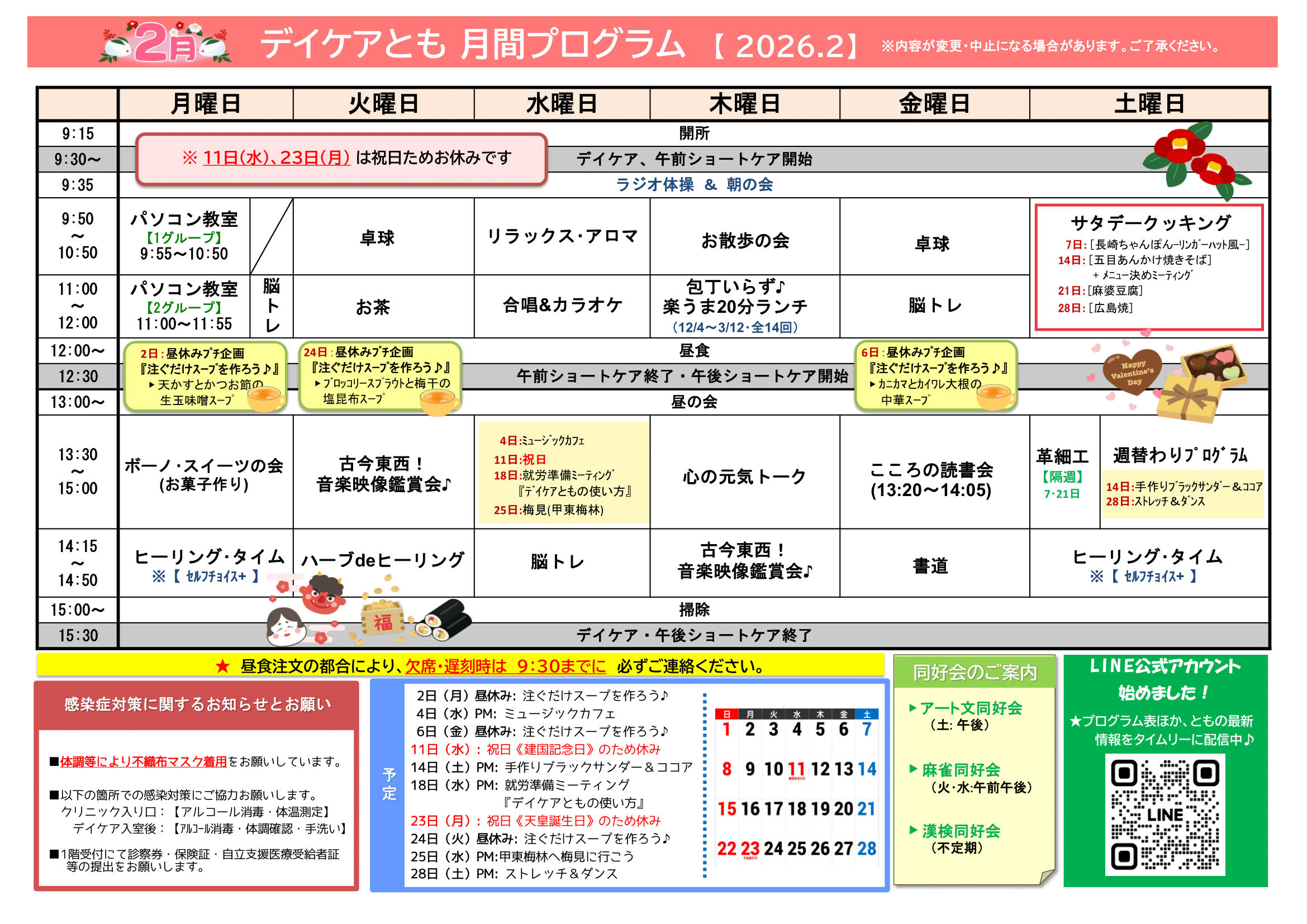 2月の月間プログラム表ができました!来月もいろいろやります♪ お楽しみに~