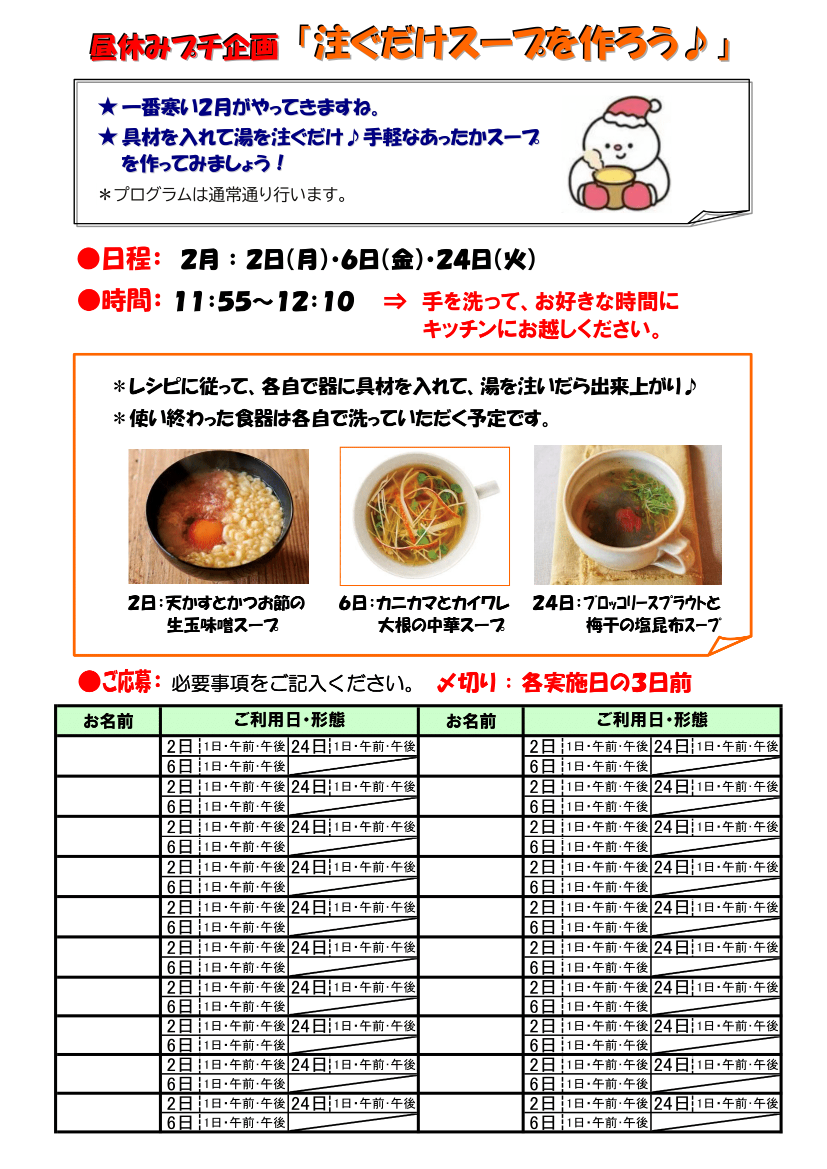 - 2月2(月)・6(金)・24(火):昼休みプチ企画「注ぐだけスープを作ろう」