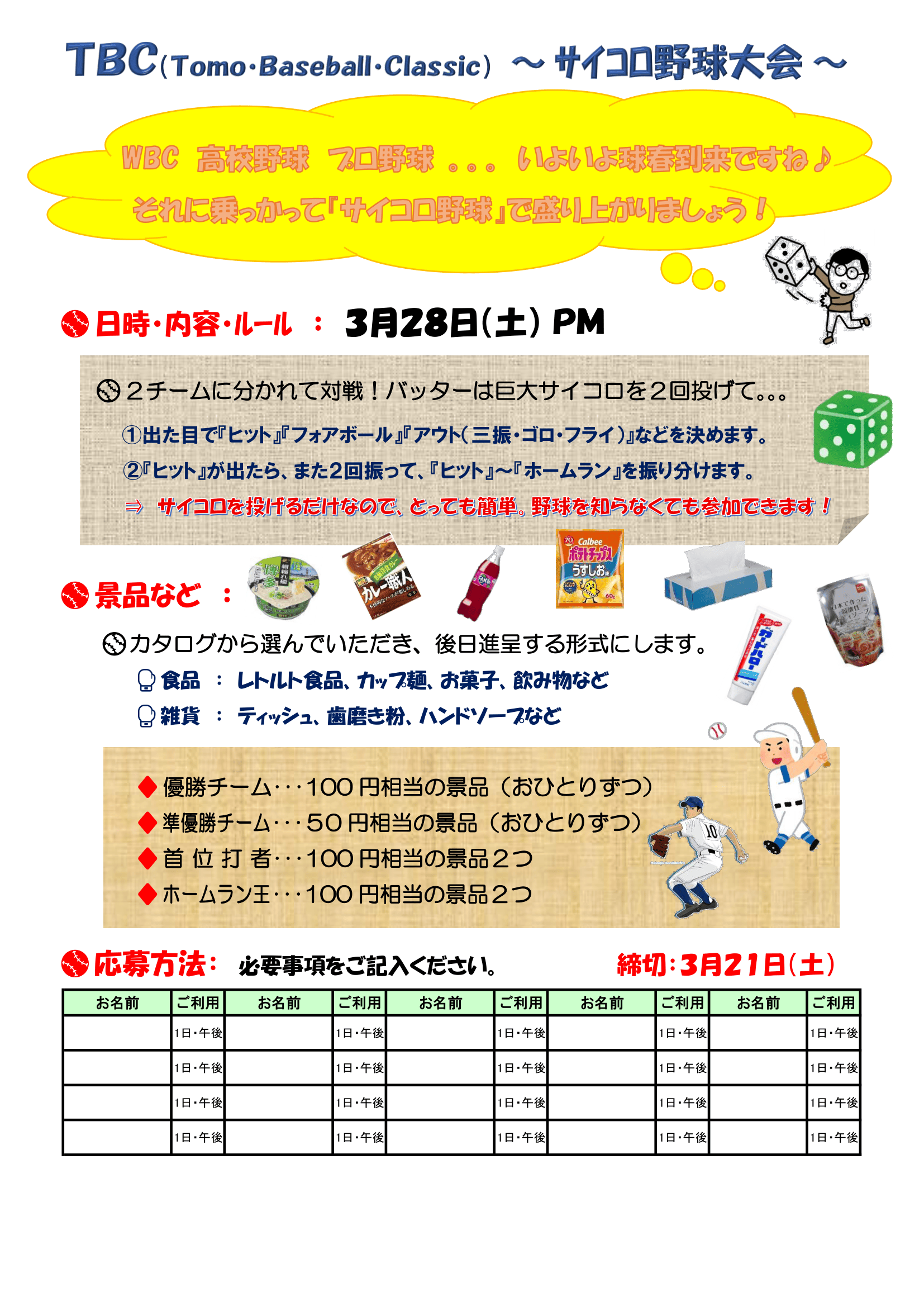 - 3月28日(土)「サイコロ野球大会」