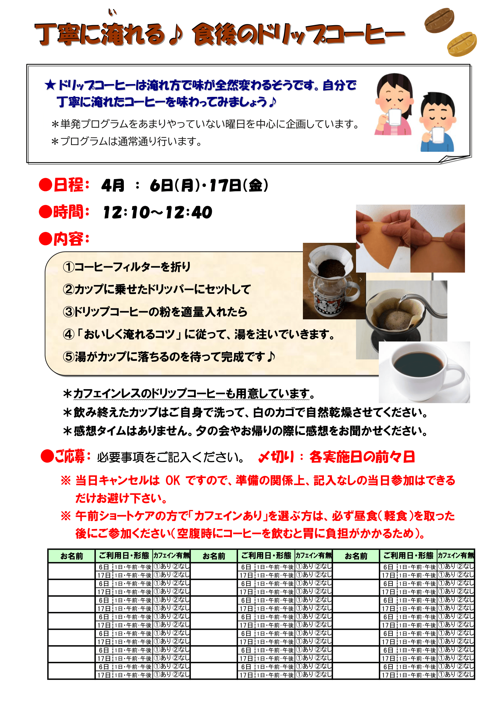 - 4月6・17日:「丁寧に淹れる♪食後のドリップコーヒー」