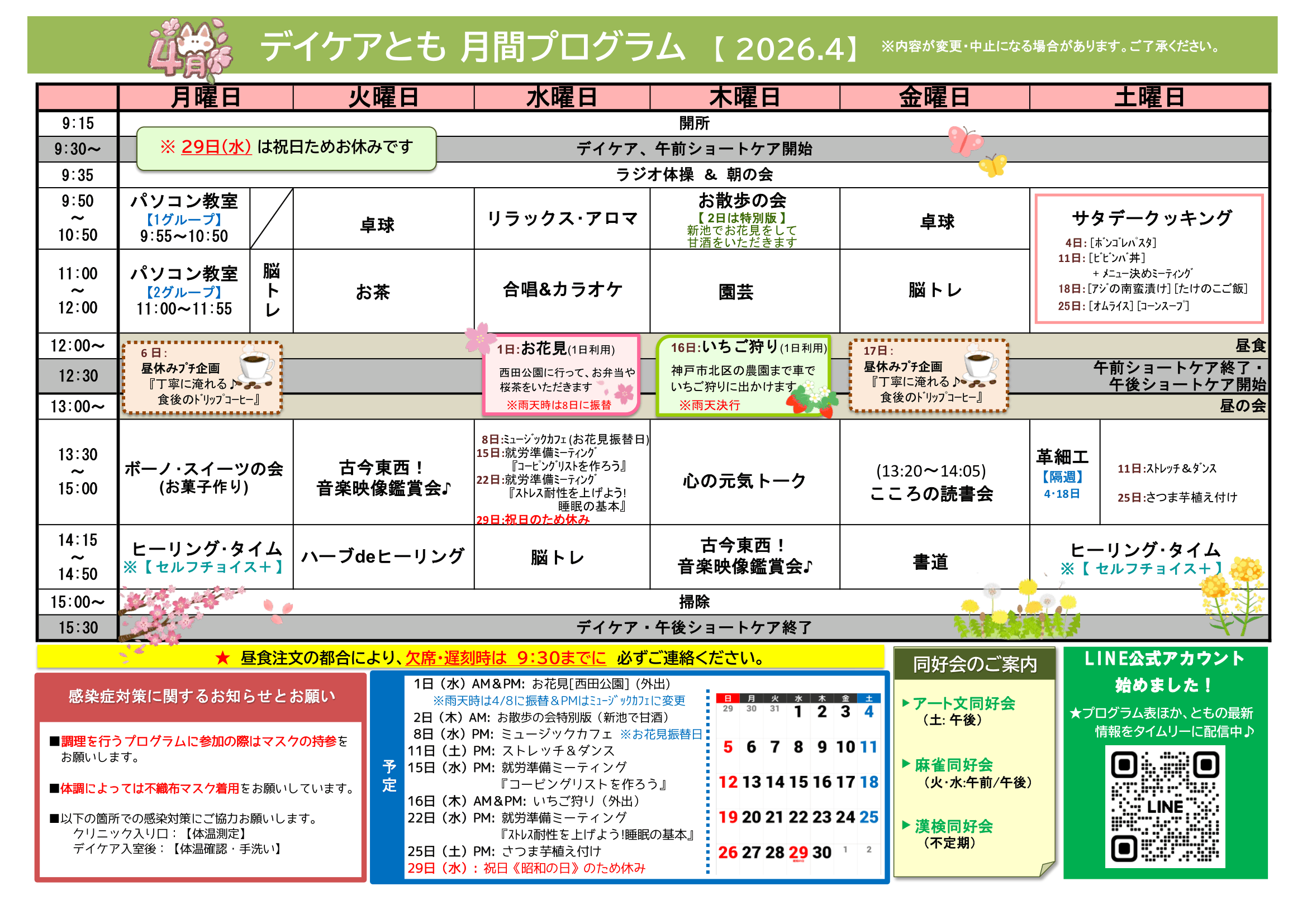 4月の月間プログラム表ができました!来月もいろいろやります♪ お楽しみに~